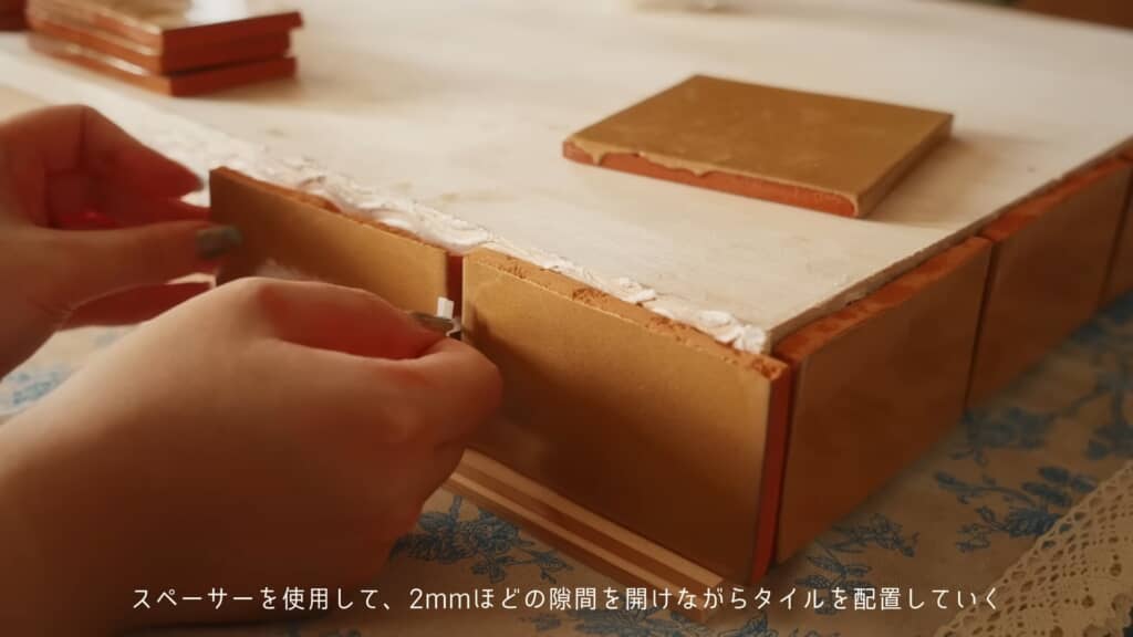 カットしたタイルは、最初に用意した天板の側面に貼り付けます。接着剤をしっかりと塗ってからタイルを置き、2ミリのスペーサーで隙間を調節しながら横面にタイルを貼り付けていきました。