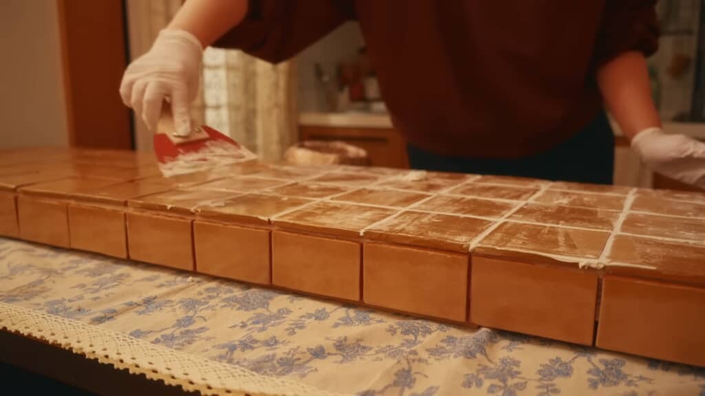 天板の天面と横面にタイルを貼り終えたら、水で溶いて粘土状になった目地材をヘラで隙間に押し込んでいきます。タイル表面についた目地材は水道に流すことができないため、厚手のキッチンペーパーを使って拭き取りました。
