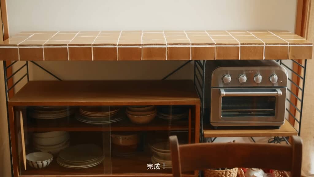 天面と横面のタイルの隙間に目地材をしっかりと詰め込んだら、しばらく乾燥させてキッチンキャビネットに設置すると完成! 元からおしゃれなキッチンキャビネットでしたが、タイルを使った天板に変えたことで、まるでカフェやレストランの一角にあるような見た目に仕上がりました。
