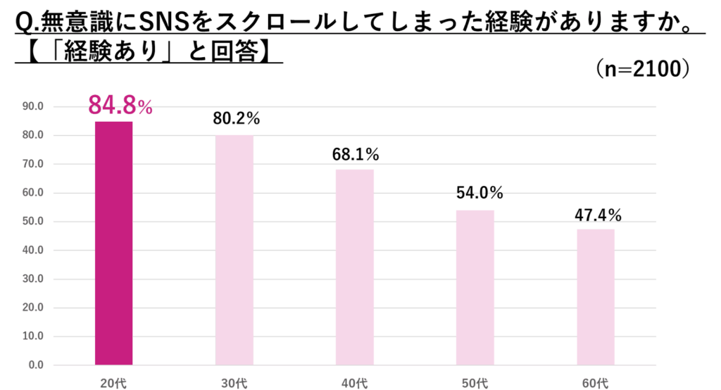 資生堂が20代~60代男女を対象に実施した調査では、全体のうち約67%が「無意識にSNSをゾンビスクロールしてしまった経験がある」と回答。特に20代で約85%、30代は約80%が「ゾンビスクロールの経験あり」と回答していて、若い世代を中心に多くの人々がゾンビスクロールしている実態が数字で明らかになりました。