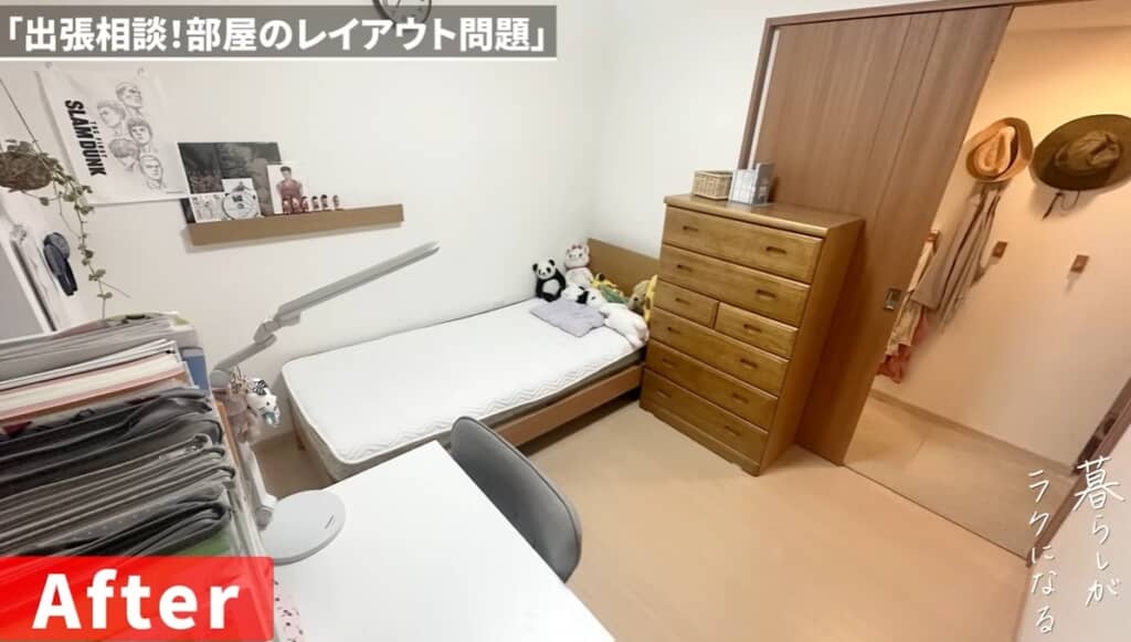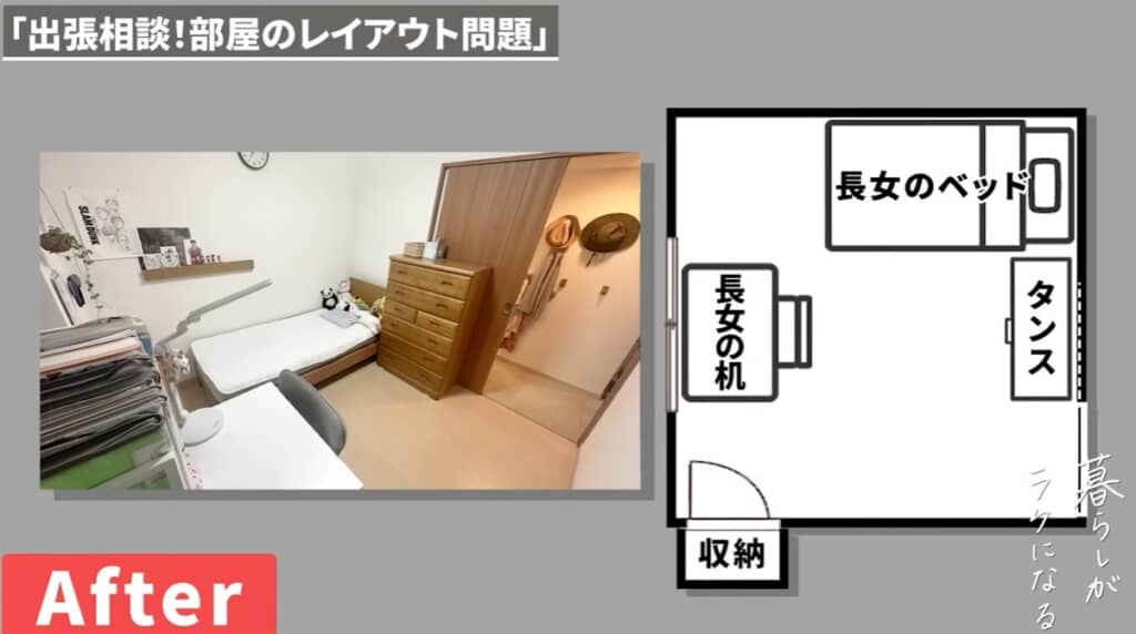 またビフォーでは、三女がランドセル置き場にランドセルを置かない問題がありましたが、アフターでは、部屋に入ってすぐのところに置き場を設けたため、帰宅後すぐにランドセルを置けるようになりました。三女は「広くなった」とうれしそう。