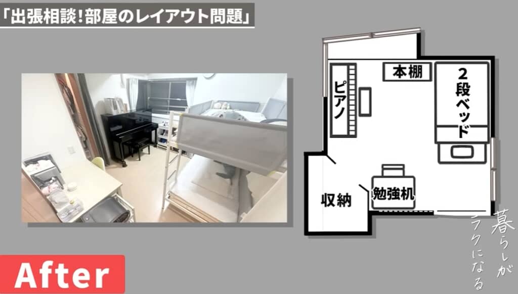 長女と三女の部屋は、入口近くにあったピアノを奥へ移動したため間口が広くなりました。大きな家具(2段ベッド、机、ピアノ、本棚)はクローゼットへの動線が悪くならないように配置しています。