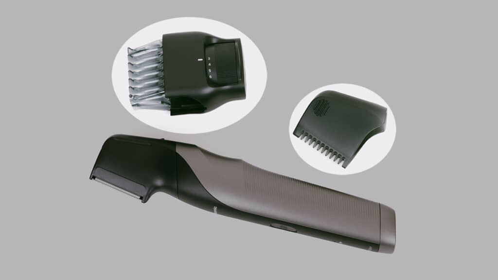 アタッチメントは、2mmでやさしくお手入れできる「肌ガードアタッチメント」と、3mm~12mmの長さ調整ができる「長さそろえアタッチメント」の2種類ある。剃るのではなく整えたい、という人はアタッチメントを使うのがいいだろう。