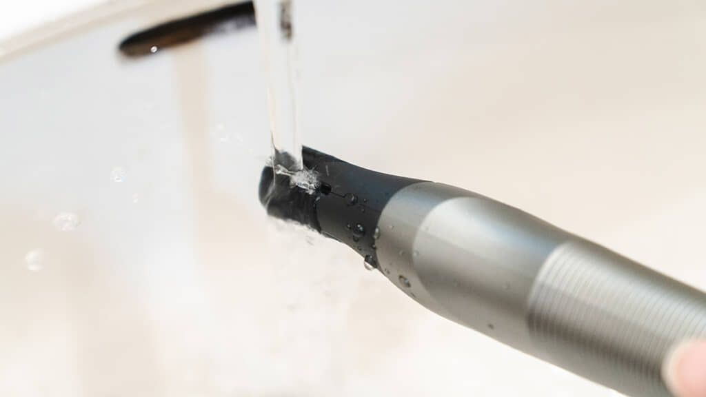 さらに、体毛を処理したあとのメンテナンスも簡単だ。「ウォータースルー洗浄」という設計で、刃の反対側から水を流せば水が通過するので、刃を外さずに毛くずを洗い流せるし乾燥もさせやすいのだ。