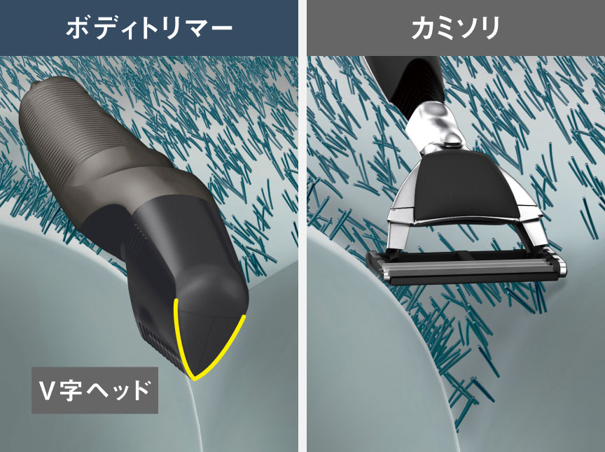 刃に近くなるにつれて薄くなるV字型のヘッド形状だから、ワキやVIOなど、不規則な凹凸がある部分でも刃をしっかり沿わせやすく、細部まできれいに剃ることができる。でも肌に優しいというのだから助かる。