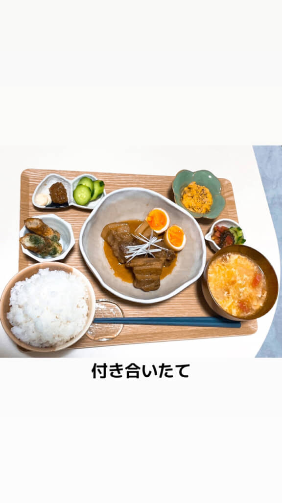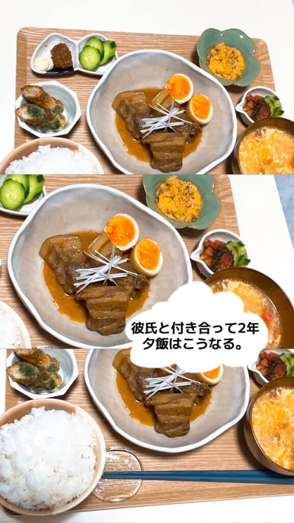 まずは約2年前の付き合いたての夕飯。ボリュームたっぷりの豚の角煮を中心に、煮卵やスープなど、約10種類の彩り豊かなメニューが並んでいます。ご飯は大盛りで、漬物などの副菜もたくさん。食器までていねいに使い分けられており、愛情が食卓にあふれています。