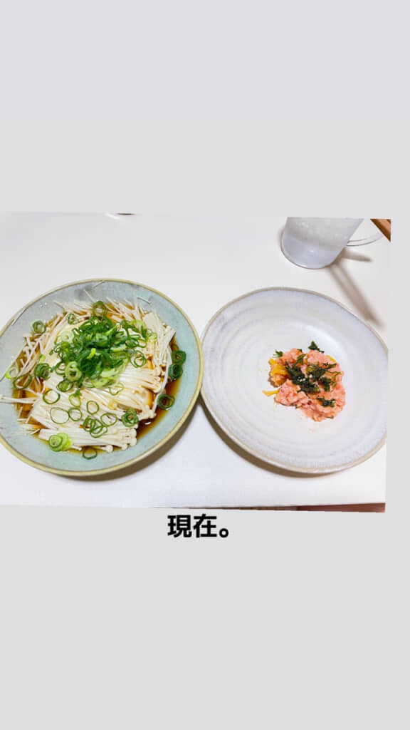 そして現在の夕飯です。ネギを振った大量のえのき茸の横には、大きな皿に少しだけ盛られたネギトロが。2年前からは想像できないほどにシンプルなメニューです。ただ、交際から2年たち相手の好みや体調を理解しきっているからこそ出せる手作りメニューといった感じで、当時と変わらない愛情を感じさせますね。