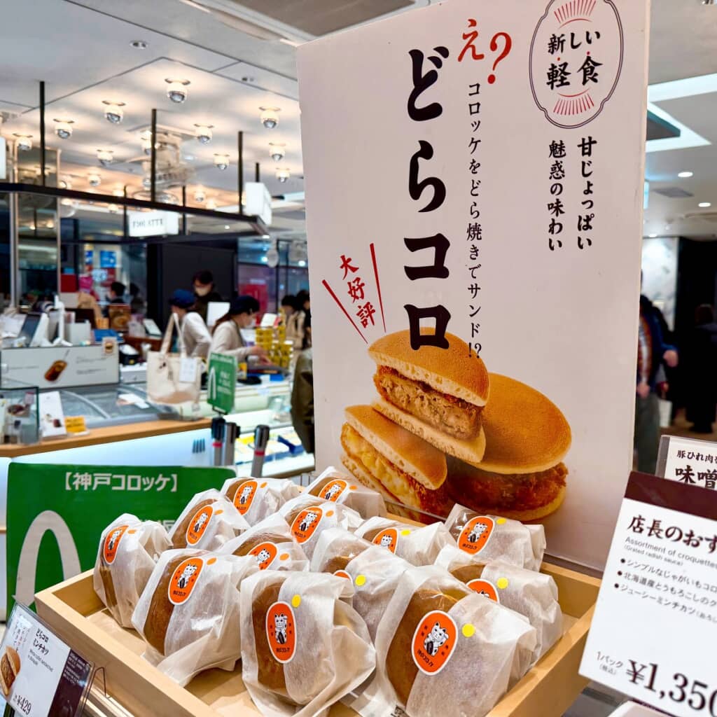 )POPの「え? コロッケをどら焼きでサンド!?」が目を引く、「神戸コロッケ」の「どらコロ」。意外な組み合わせだが「甘じょっぱい魅惑の味わい」が好評で、品川駅などで旅のお供として人気を集めている
