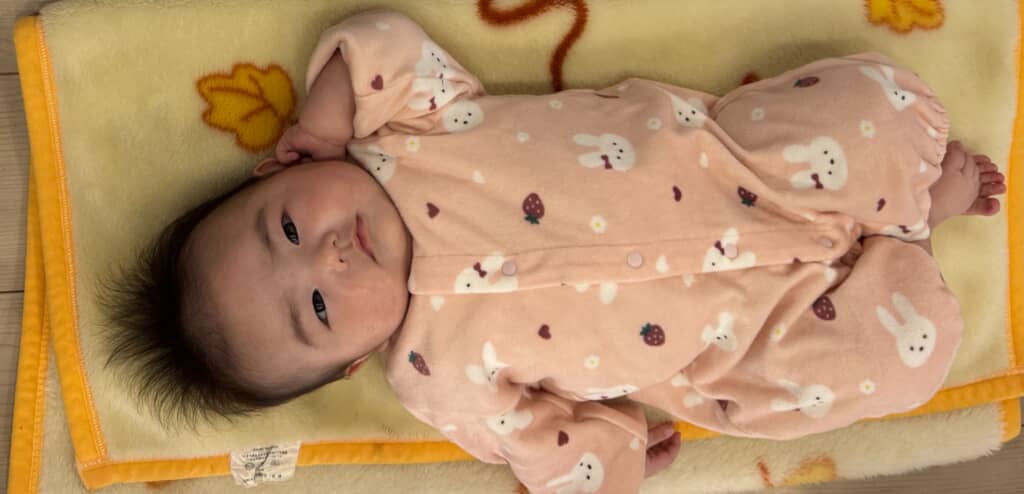 投稿者はXユーザーで釣り人の将也(@turi0612m)さん。話題になったのは2025年10月に誕生した三女のお食い初めのために用意したものの写真です。床に敷かれたブランケットの上に寝転ぶ三女ちゃん。その隣には……。