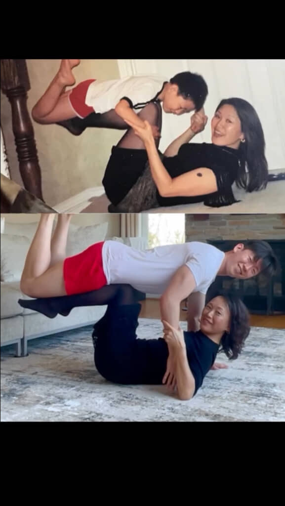 20年前の写真には、床に寝転んだお母さんの脚の上で、飛行機のようなポーズをとる幼い息子さんの姿がありました。そして20年後、すっかり大きく成長した息子さんが当時と同じポーズでお母さんの脚の上に乗っかります。