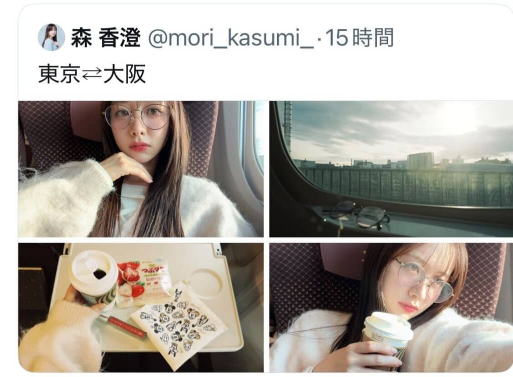東京と大阪を新幹線で移動したとする森さんは、車内で撮ったメガネ姿の自撮り写真や、窓際の写真などを4枚投稿。しかし15時間後、「気分が悪いので消しました」と、新幹線での投稿を削除しました。