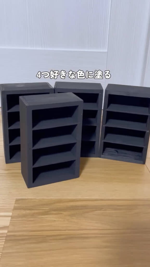 まずは、4つの木製ボックスを好きな色に塗り、乾いたら鉄板風シートを仕切りに貼っていきます。次に2つのボックスをボンドで貼り合わせ、残りの2つを上にかぶせて蝶番で固定。左右にパカッと開く、観音開き仕様になりました。