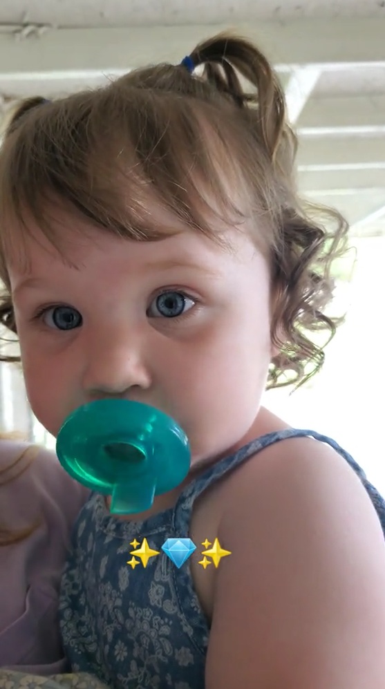 最後に登場するのは、さらに成長した現在の姿です。おしゃぶりをくわえ、カメラをじっと見つめるその瞳は、はっきりとしたブルーへと変化しました。新生児のころの黒からは想像できないほど大きな変化ですね。