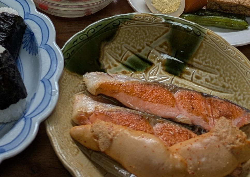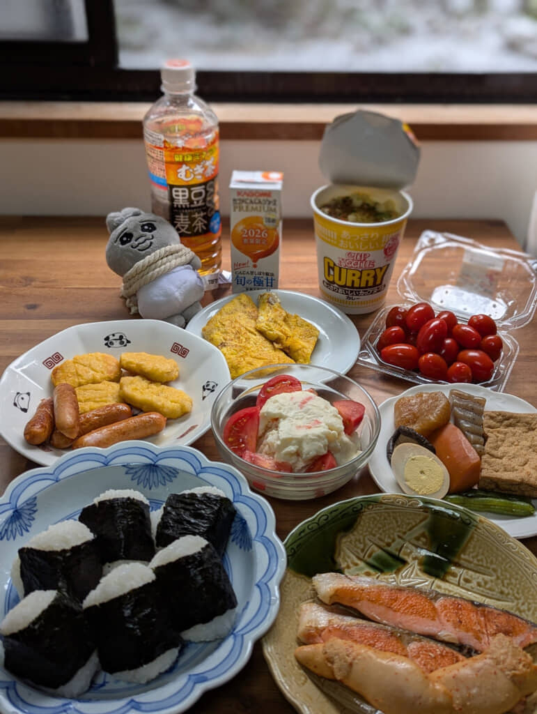写真には、テーブルいっぱいにたくさんの料理が写っています! ソーセージに卵焼き、ポテトサラダや筑前煮。おにぎり6個に鮭2切れ、そして奥にはカップヌードルまで置かれており、その数なんと約10種類。朝からすごい量だ……。