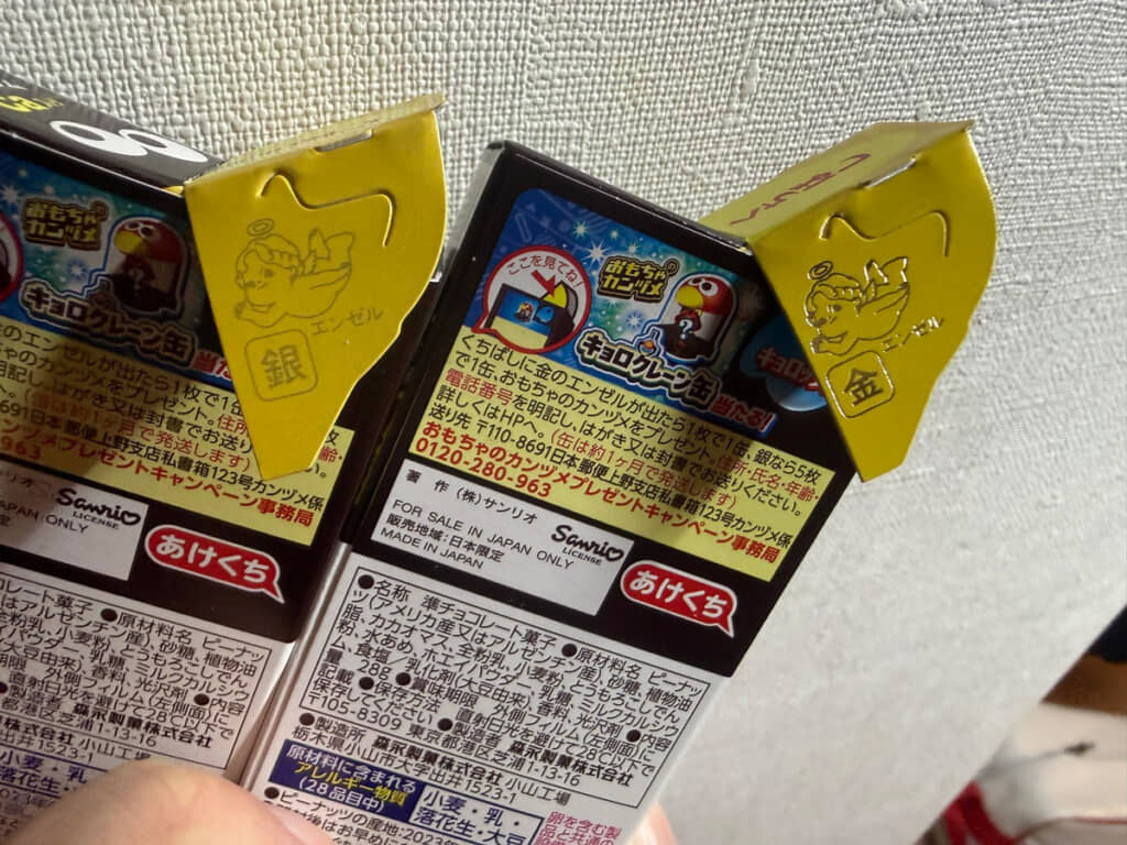金のエンゼル1枚、銀のエンゼル5枚を集めて応募すると「おもちゃのカンヅメ」というアイテムと交換できましたが、2024年以降は「金のキョロメダル缶」か「キョロクレーン缶」のどちらかと交換できるとのこと。一般的にエンゼルが当たる確率は数パーセント以下といわれ、どちらかのエンゼルが出ることですら珍しいのですが、一気に両方が当たるなんて……!