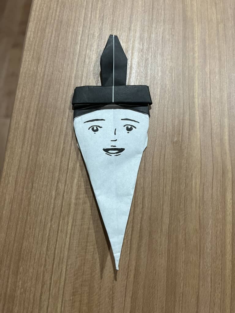 わたなべさんが作った御門は、黒色の折り紙で冠を、裏側の白色で顔を表現。目鼻口をペンで描き加えており、とってもクオリティが高いのですが……アゴ部分が顔と同じ長さになっていますね。さすがに長すぎる……けど違和感はない!