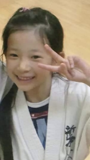 )空手の道着に身を包み、きりっとした表情を見せる子ども時代。幼いながらも芯の強さを感じさせる姿が印象的