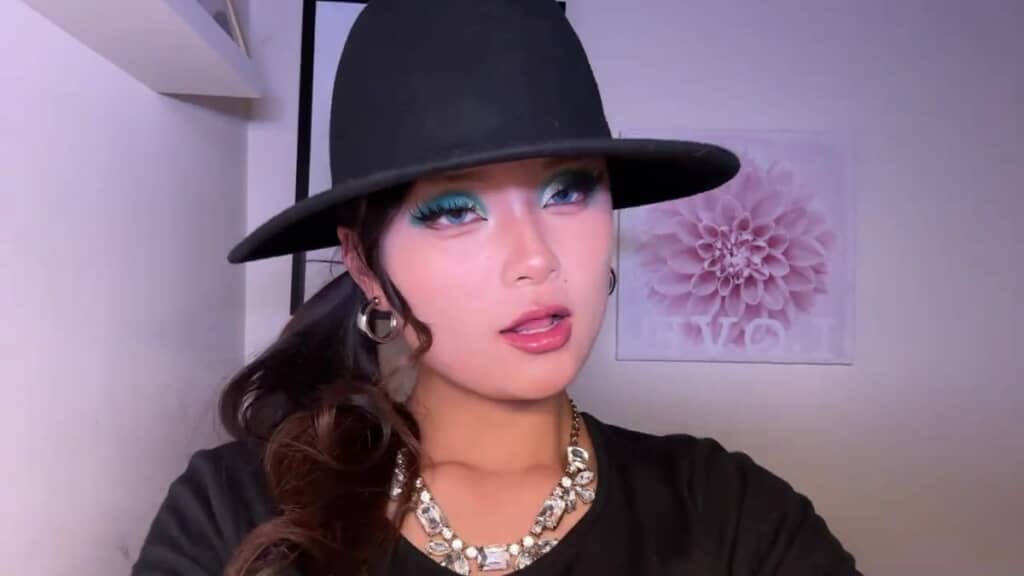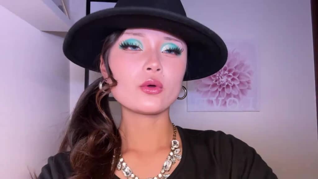 特に目を引くのは、鮮やかなターコイズのアイシャドウ。まぶた全体にのせたブルーグリーンの発色に、目尻に向かって長くボリューム感のあるつけまつ毛が重なり、その印象的な目元に視線を奪われますね。さらに、つややかなリップと立体感のあるハイライトが14歳とは思えないアンニュイな表情を引き立てており、大人顔負けのオーラを放っていました。