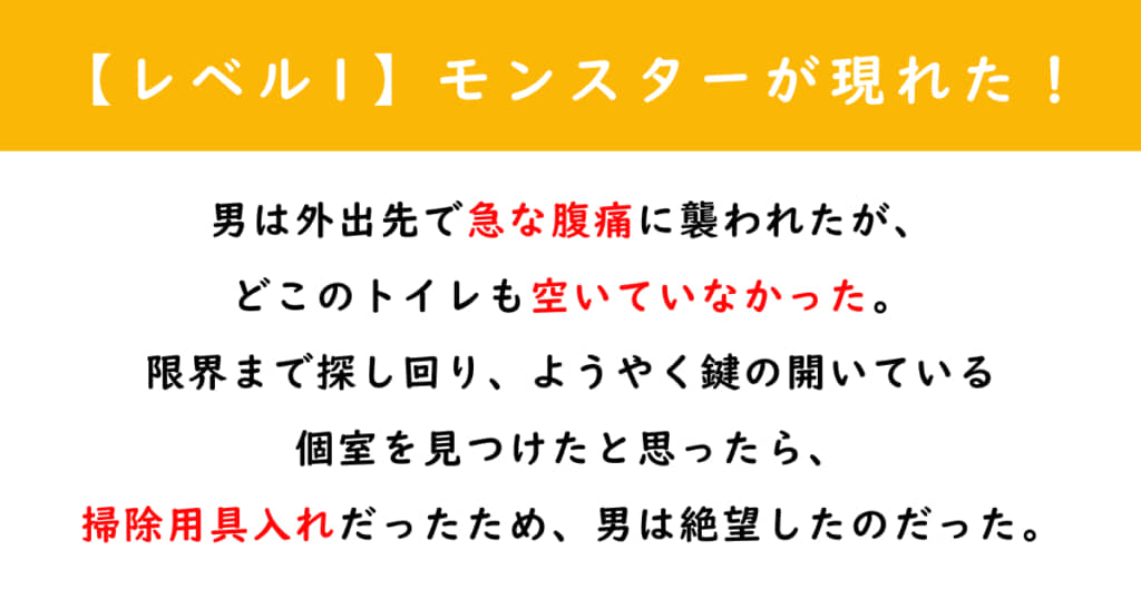 【解答】男は外出先で急な腹痛に襲われたが、どこのトイレも空いていなかった。限界まで探し回り、ようやく鍵の開いている個室を見つけたと思ったら、掃除用具入れだったため、男は絶望したのだった。