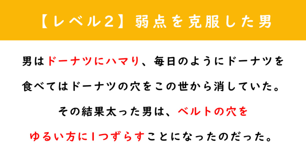 【解答】男はドーナツにハマり、毎日のようにドーナツを食べてはドーナツの穴をこの世から消していた。その結果太った男は、ベルトの穴をゆるい方に1つずらすことになったのだった。