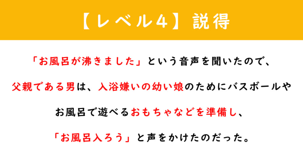 【解答】「お風呂が沸きました」という音声を聞いたので、父親である男は、入浴嫌いの幼い娘のためにバスボールやお風呂で遊べるおもちゃなどを準備し、「お風呂入ろう」と声をかけたのだった。