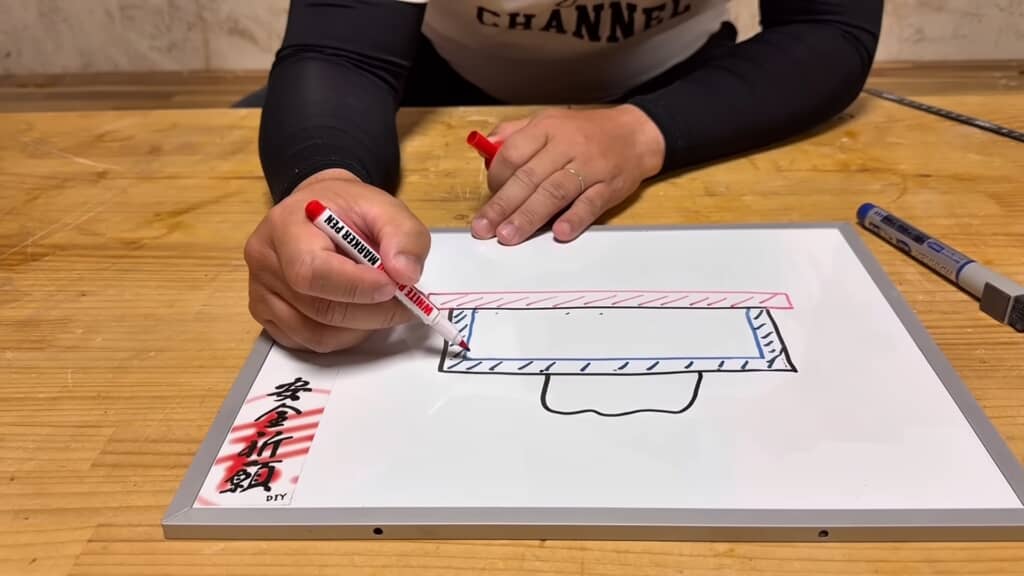 普段からよくティッシュを使うことから、手が届く場所にサッと取り出しやすいティッシュボックスがほしかったといい、ティッシュの箱を逆さまにして下から取り出せるようにしつつ、壁に設置して物が置ける棚としても機能するように設計を考えます。