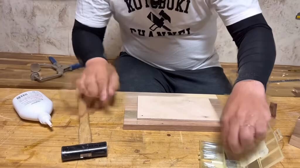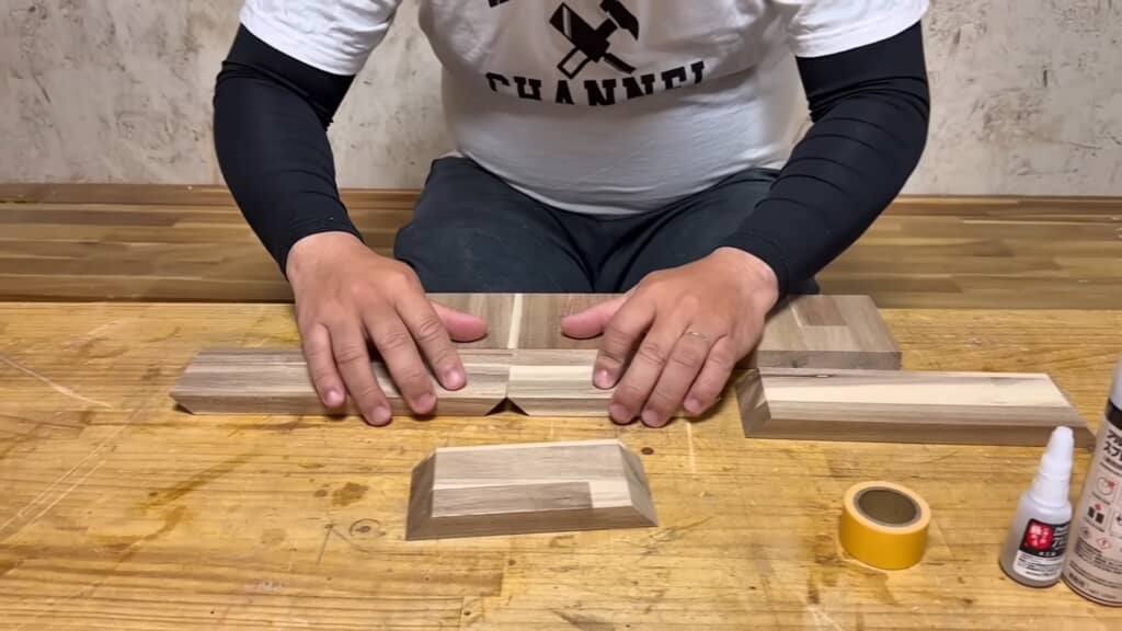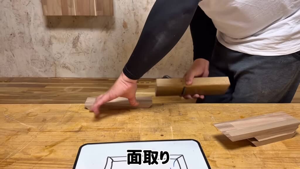 カットした木板は、かんなをかけて面取りを施してから、横一列に並べてテープで仮止めします。接着剤と硬化剤を付けて組み立てると、立派な木枠が出来上がりました。試しにティッシュの箱を入れてみるとすっぽり収まりました。サイズ感は完璧ですね。