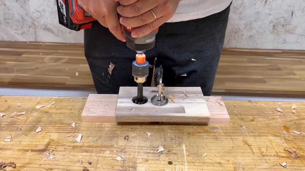次は底面に使う木板を切り出して、ティッシュの取り出し口になる細長い穴を開けていきます。クランプでしっかりと固定した木板に、電動ドリルで穴を2つ開けて、その穴を繋ぐようにのこぎりで切っていきます。