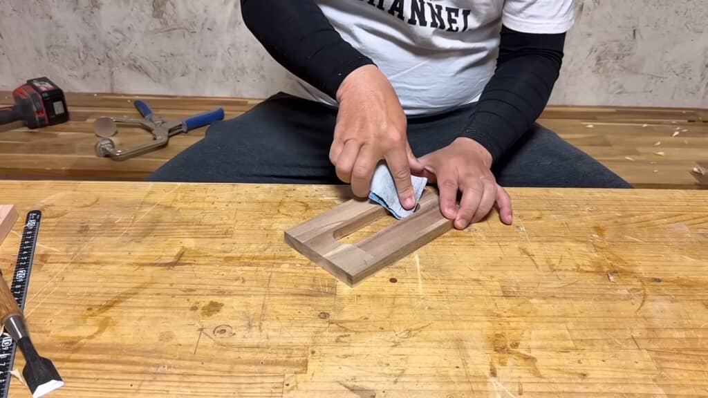 底面を取り付けたところで木枠の間に出来た隙間にボンドを流し込みます。ティッシュやしっかり絞った濡れ雑巾で表面を拭き取ってから、紙やすりで軽く磨いてやると隙間が埋まってきれいに仕上がるそうです。
