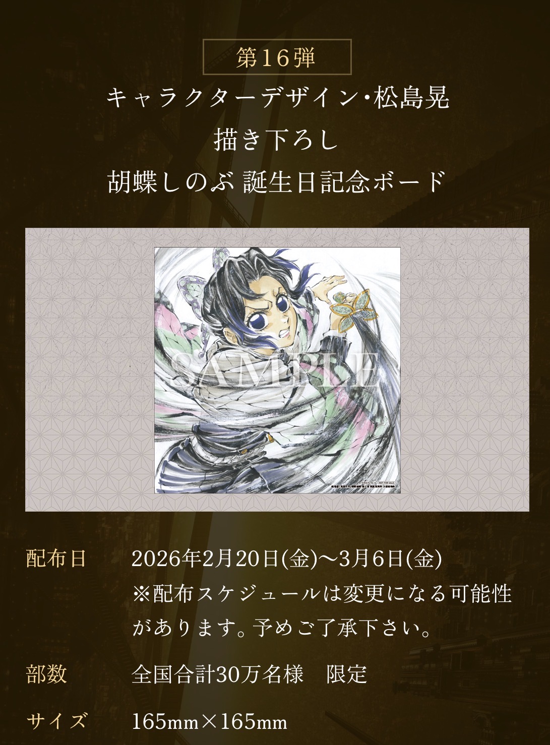 新特典は、「キャラクターデザイン・松島晃描き下ろし胡蝶しのぶ 誕生日記念ボード」。2月24日の誕生日を祝して描き下ろされた、胡蝶しのぶのスペシャルボードです。