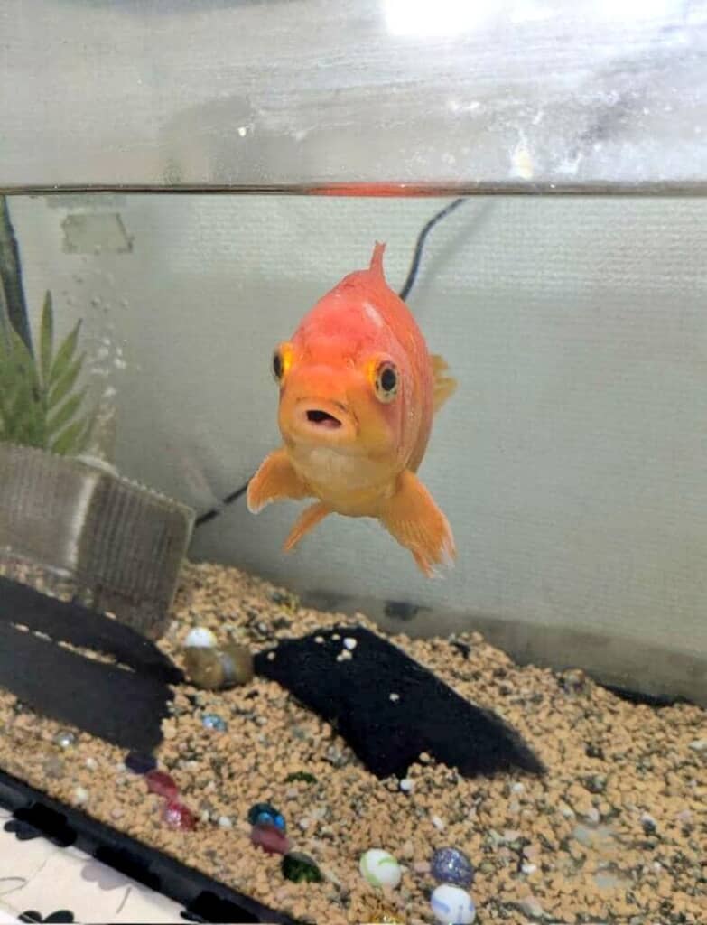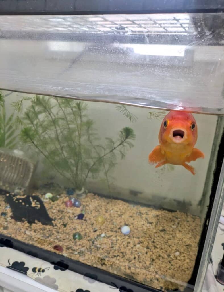 「顔がうるさいタイプの金魚」というコメントとともに投稿された金魚さんの写真を見てみると……目をギョッと見開きながら、お口もぱっくりと大きく開けていました。おぉ……これは圧が強い。