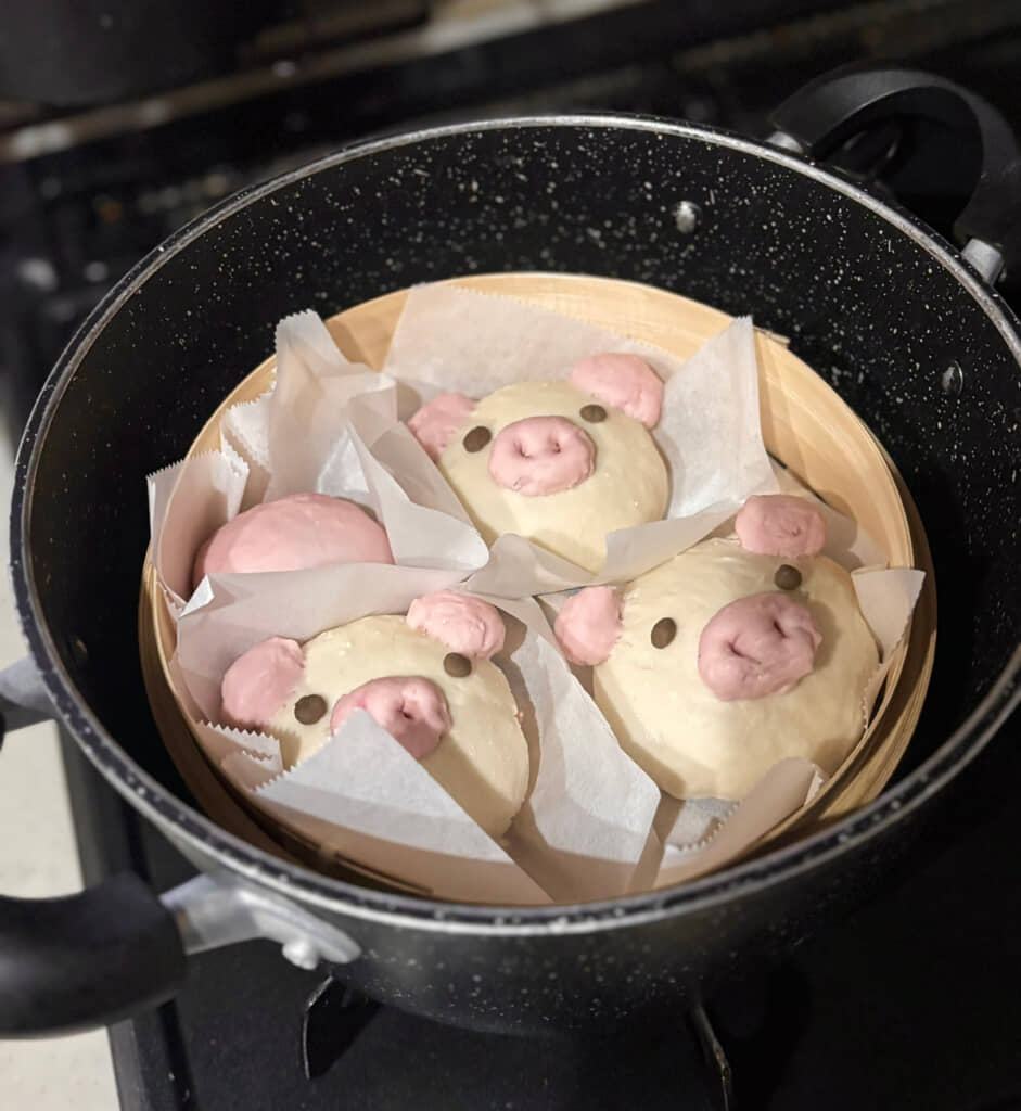 調理にはフライパンやせいろを使用しました。底の深いフライパンにせいろを入れ、底に水を入れて蒸しあげたようです。蒸す前は真ん丸で白い肌にピンク色の鼻と口、くりっとした目が特徴的。デフォルメしたブタのようなかわいい見た目ですが、蒸すとどうなるのか……?