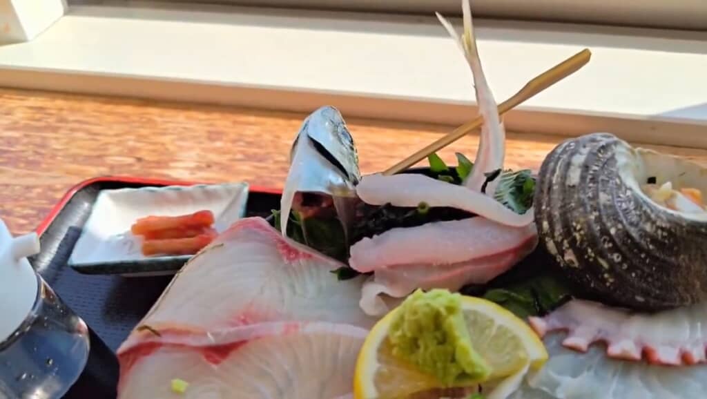 もりっつさんがアジの頭にカメラを寄せると、驚くことにまだエラがピクピクと大きく動いている生け造りとなっているのが分かります。これほどの新鮮さ、フタを開けて思わずびっくりしてしまう人もいるのではないでしょうか……!