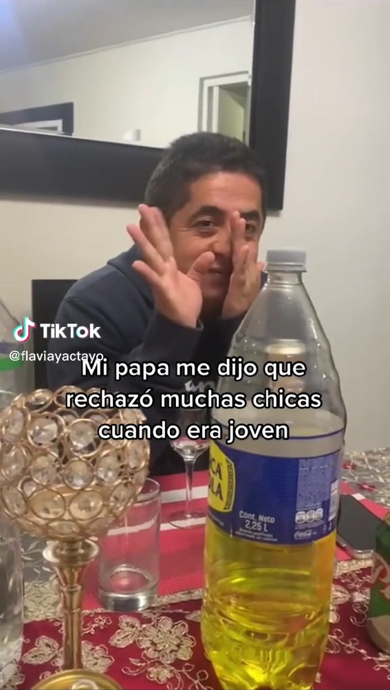 今回紹介するのは、「昔はモテた」という父の若い頃の写真を公開した動画です。動画の冒頭に登場するのは、食卓を囲む穏やかな日常のワンシーンです。テーブルの上には大きなボトルやグラス、装飾的なオブジェが並び、家庭的な空気が漂っています。