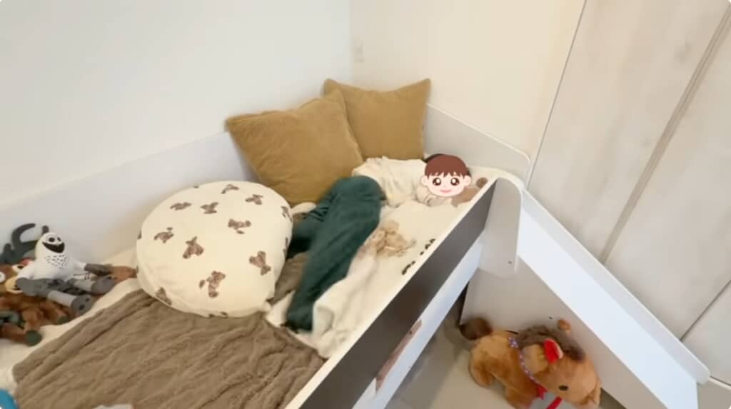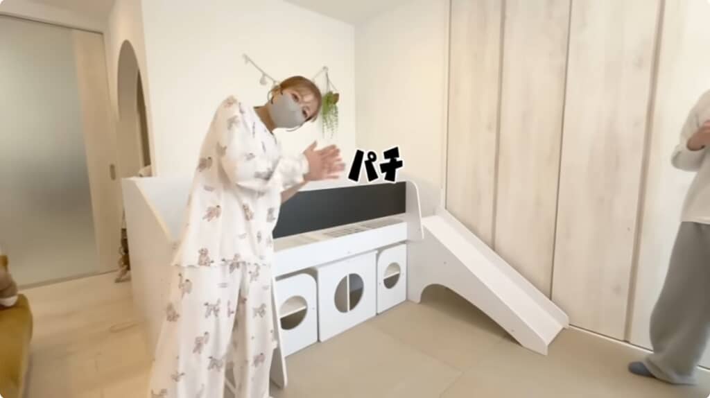 「最近基地を作って遊ぶのにハマってるから喜ぶんじゃないかなと思って」と幸空くんへ“滑り台付きベッド”を買ってきたといい、本人が学校へ行っている間に組み立ててどこかに隠す算段だと視聴者へ明かしました。