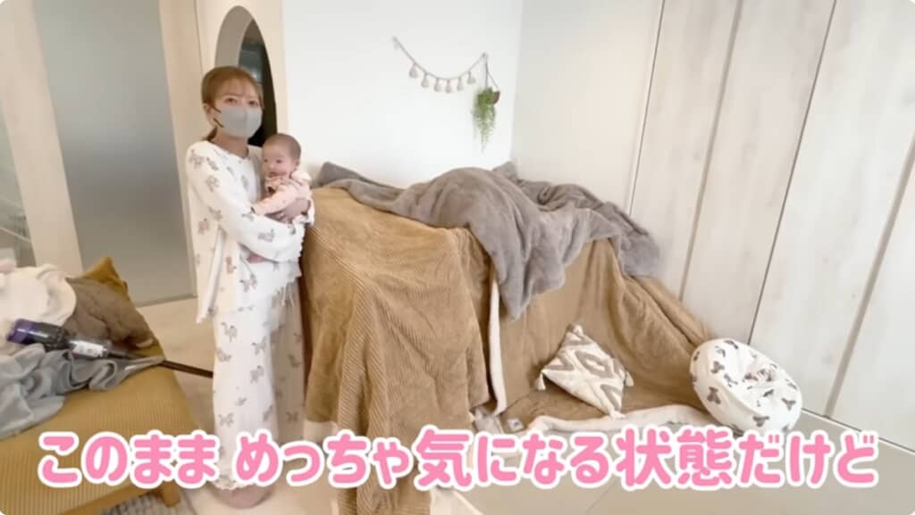 辻さんは完成品にすかさずシーツやクッションなどを大量にすっぽりかぶせて「めっちゃ気になる状態だけど明日を迎えられるように頑張りたい」と抱負。