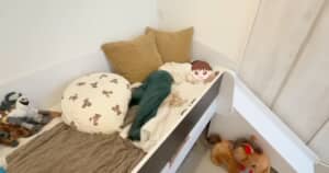 動画の中では、ひと晩をどう乗り切ったか説明されなかったものの、幸空くんが堂々たるベッドに大興奮する場面はしっかりと収録。幸空くんは喜びのあまりか、頭を抱えて「えっえっえっ!?」「ヤバ!!」と連発し、ベッドの上下で転げ回って「うわぁぁい!」と声を張り上げるのでした。