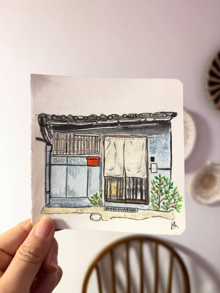 部屋に残されていたのは、1枚の紙。そこにはなんと手の込んだ水彩風のタッチで「Watako Guest House」のイラストが描かれていたのです。風に吹かれている暖簾の様子や玄関横の樹木などが優しいタッチで描かれ、ゲストが滞在を喜んでいたのが伝わってきます。そのまま雑誌や書籍の挿絵に使われていたとしても違和感のないクオリティーです。粋すぎる!