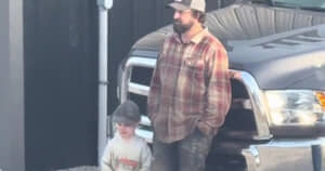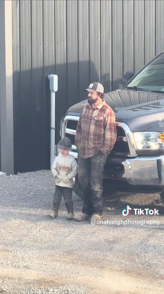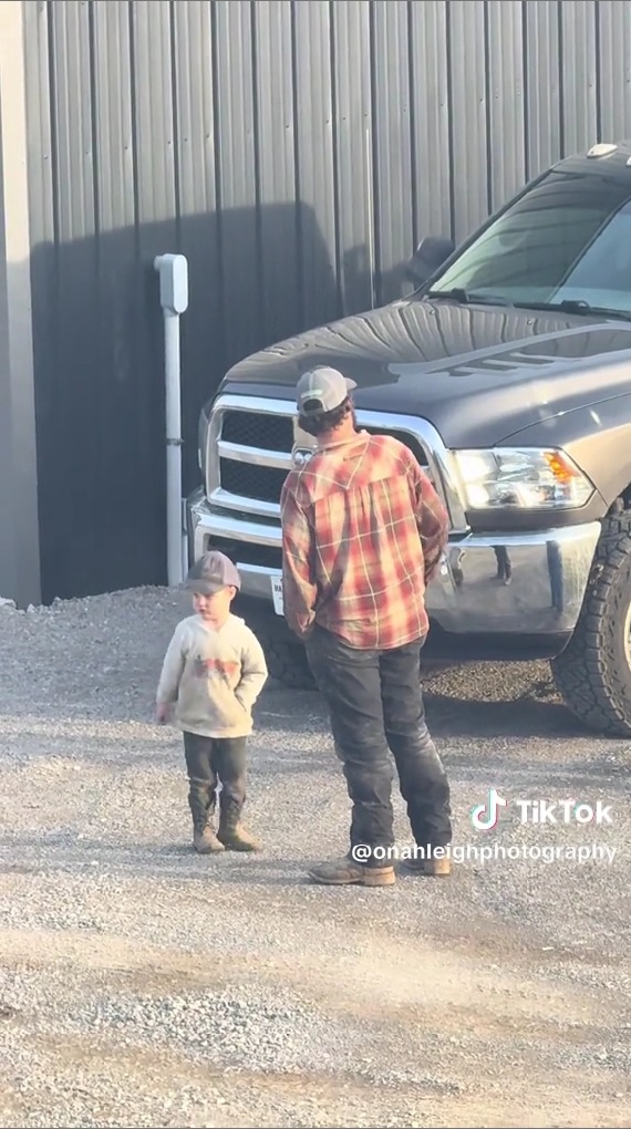 今回紹介するのは、パパのマネをする息子の姿を捉えた動画です。動画ではパパと息子が外に停められた大きな車にもたれかかって立っています。パパはチェック柄のシャツに作業用パンツ、キャップを着用しており、足元には泥汚れも見え、作業の合間のような雰囲気です。