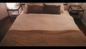 ポリエステル素材の寝具は苦手とのことで、布団カバーは綿100%のものをチョイス。シーツ類は白で統一しつつ、クッションやマルチカバーでブラウンの色味を重ね、あたたかみのある雰囲気もプラスしていきます。