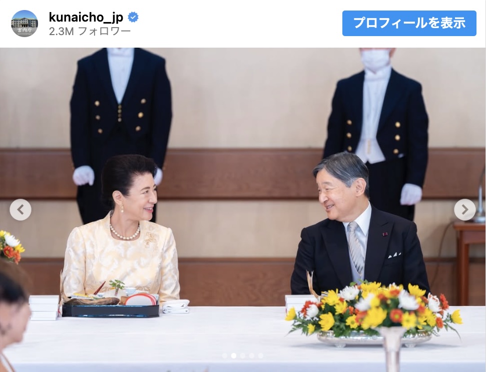 公式Instagramで公開されたショットは5枚あり、天皇陛下があいさつされる場面などが収められています。写真には皇族方や参加者の前に置かれた料理も写り込んでおり、メニューは1匹まるごとの「鯛の塩焼き」や「日の出かまぼこ」などとみられます。