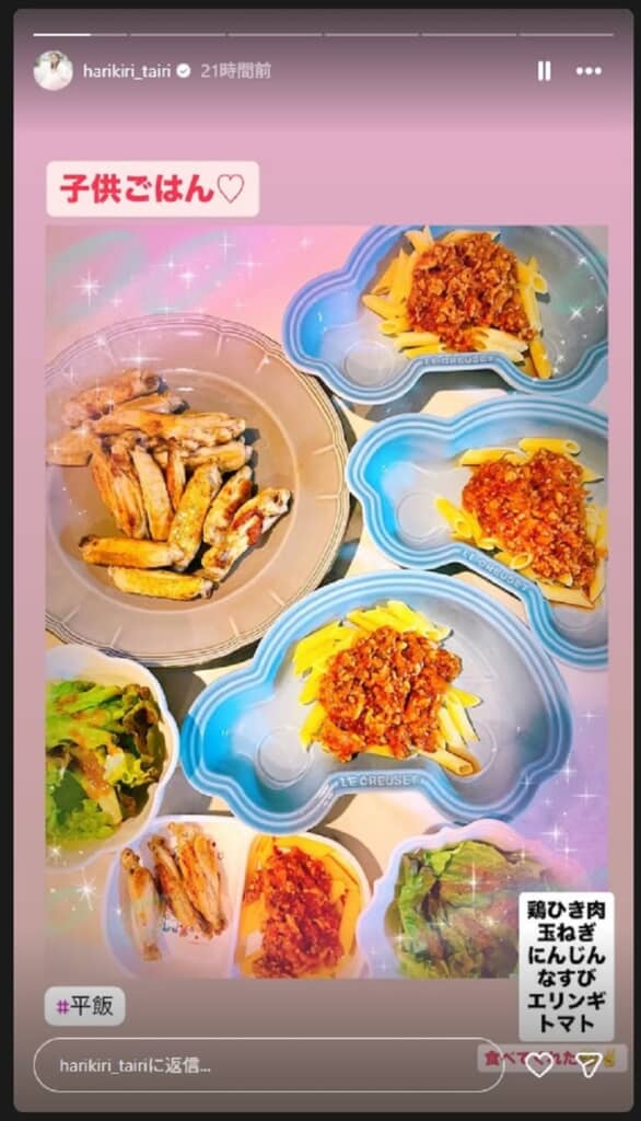 平さんは2月25日、鳥のひき肉やにんじんなどを使ったちょっとしたメニューを“子供ごはん”と称してストーリーズに公開しました。