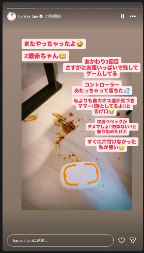 「またやっちゃったよ 2歳赤ちゃん」「おかわり3回目 さすがにお腹いっぱいでゲームしてる」「コントローラーあたっちゃって落ちた」とつづっており、同様の事態が過去何度か起きていたことを示唆していました。