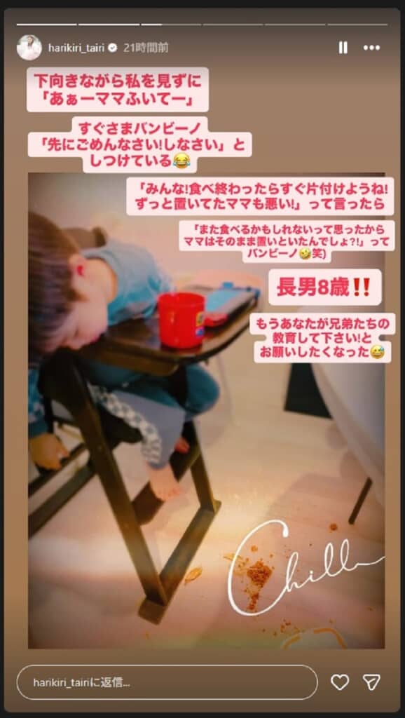 平さんより周囲にいた他の兄たちが先に気付いて騒ぎ立てたといい、次男は「ダメでしょ!!」「勿体ない!!」とママに代わって怒ったとのこと。しかし、当の平さんは「すぐに片付けなかった私が悪い」とまだ幼い子どもの動きを予測できなかった自身の至らなさを反省しきりの様子です。