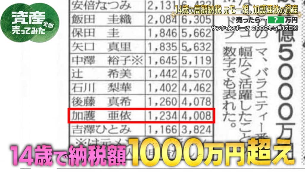 当時は高額納税者公示制度(2005年廃止)があり、加護さんは14歳で“1000万円超えの納税額”が世間に晒されることに。