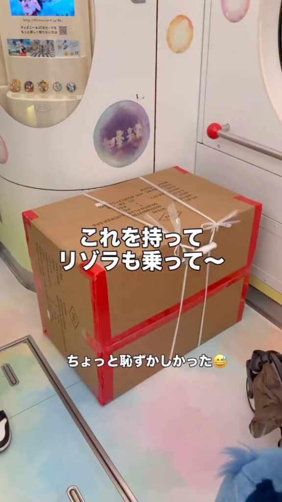 巨大な箱を抱えたまま、ディズニーリゾートラインへ乗り込みます。周囲の視線も集まりそうなビッグサイズに「ちょっと恥ずかしかった」と語るわにこさん。