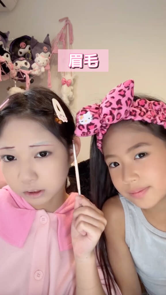 しかし、眉メイクに取り掛かると、雰囲気は一変。長女はピンクでハの字に下がった“困り眉”を描き、次女は肌なじみのいいブラウンでナチュラルに整えていきます。