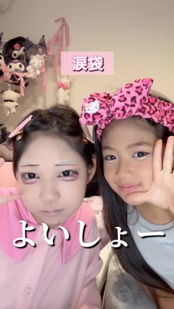 さらにアイメイクでは、長女はピンク系のアイシャドウをチョイスし、“地雷ライン”で垂れ目風に。下まぶたにしっかりと涙袋ラインも描き、自まつげにマスカラを塗り束感を出していきます。