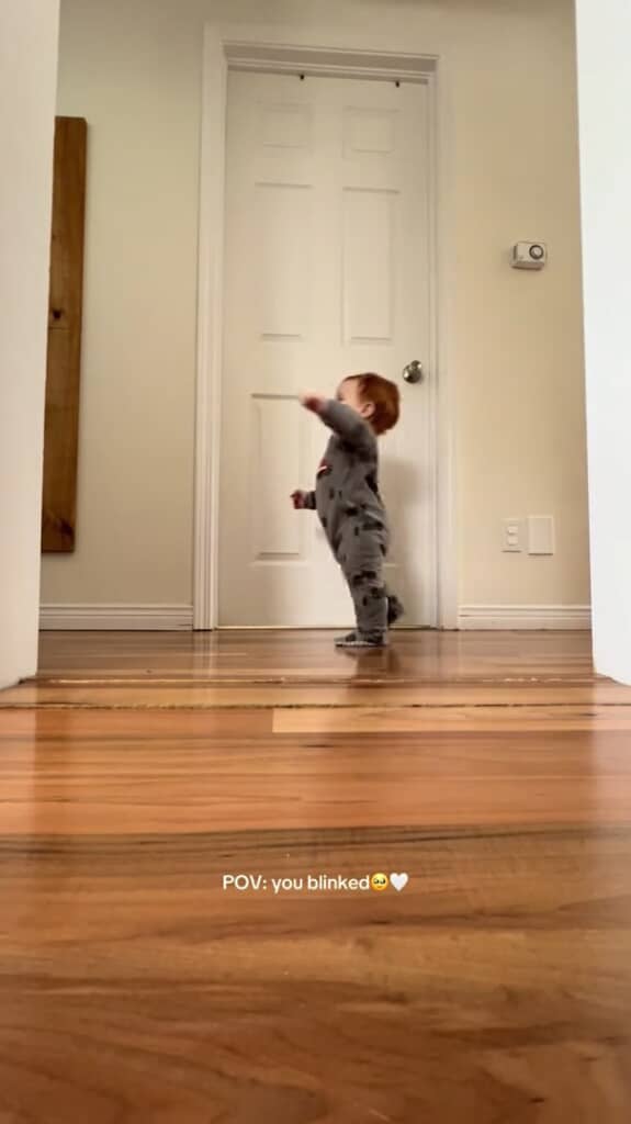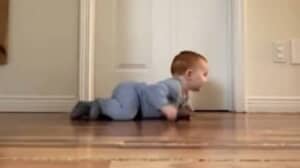 動画の冒頭では、ずりばいをして廊下を渡っていく赤ちゃんの姿が。ずりばいができるようになり、自力で移動することが可能になった彼は、小さな身体を一生懸命に動かしてどこかへ向かっています。自由を手に入れた喜びにあふれるような笑顔も、かわいいですね。