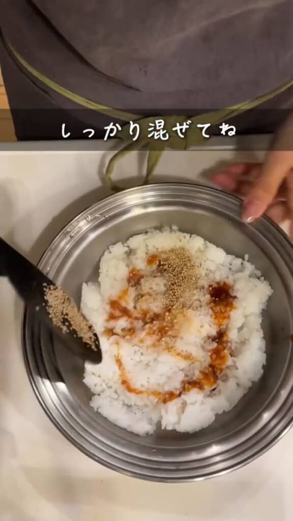 まずはごはんに焼肉のタレとゴマを入れてしっかりと混ぜ、味を付けます。冷めたら味がぼやけるので、お弁当のときはごはんに味付けしておくのが良いとのこと。